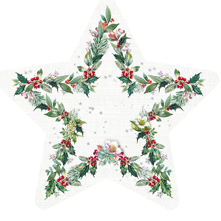 Shaped like a shining star, this paper lunch napkin is adorned with watercolor greenery, berries, and scattered stars for a fresh, botanical sparkle. Its sturdy, soft paper and eye-catching silhouette elevate everyday meals and special gatherings with an effortless touch of style. Approximate dimensions are 6.5 x 6.5 x 1 inches. German printed on soft, 3-ply paper.