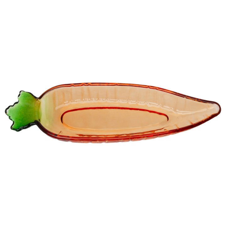 Bring playful garden charm to the table with our Carrot Glass Dish, sculpted in translucent orange and green to showcase its crisp, carrot-inspired silhouette. Perfect for crudités, small sides, or sweets, this glass serveware piece elevates everyday spreads with a pop of color and conversation-starting style. Approximate dimensions are 10.25 x 3 x 1.25 inches.