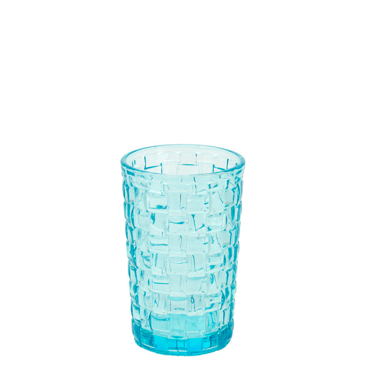 Saturated in a Blue Sea hue, this drinking glass showcases a raised basketweave pattern that catches the light and offers a comfortable, tactile grip. Crafted of durable glass for everyday sipping, it brings pattern-rich charm to water, iced tea, and your favorite mixed refreshments at the table. Approximate dimensions are 4.25 x 4.25 x 5 inches.