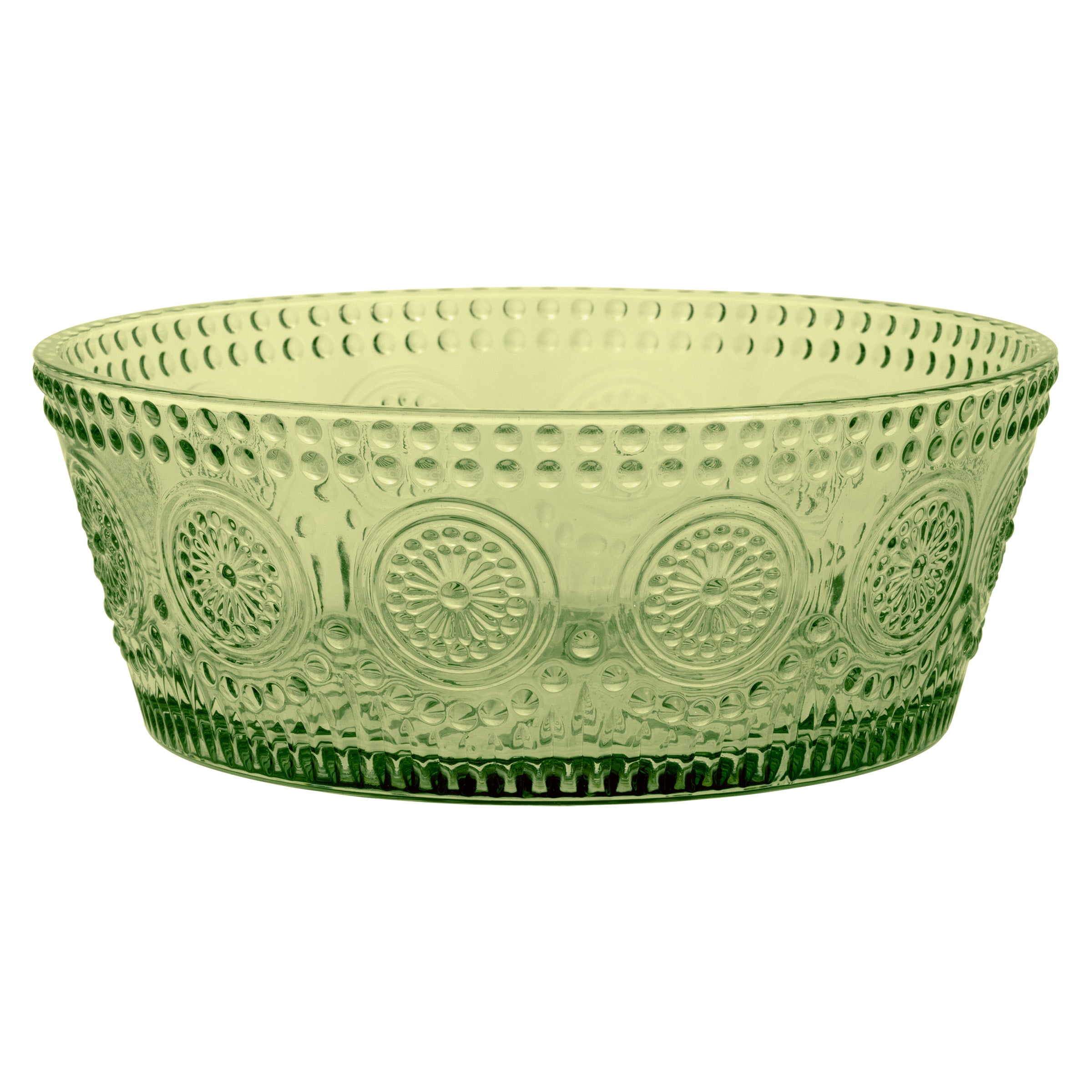 Sculpted in olive-tinted glass, the Olive Codi Glass Bowl - Large showcases raised medallions and dotted textures that catch the light with vintage-inspired charm. Generously sized for salads, fruits, or a striking centerpiece, this patterned serveware adds depth and character to everyday tables and effortless entertaining. Approximate dimensions are 7 x 7 x 2.75 inches.