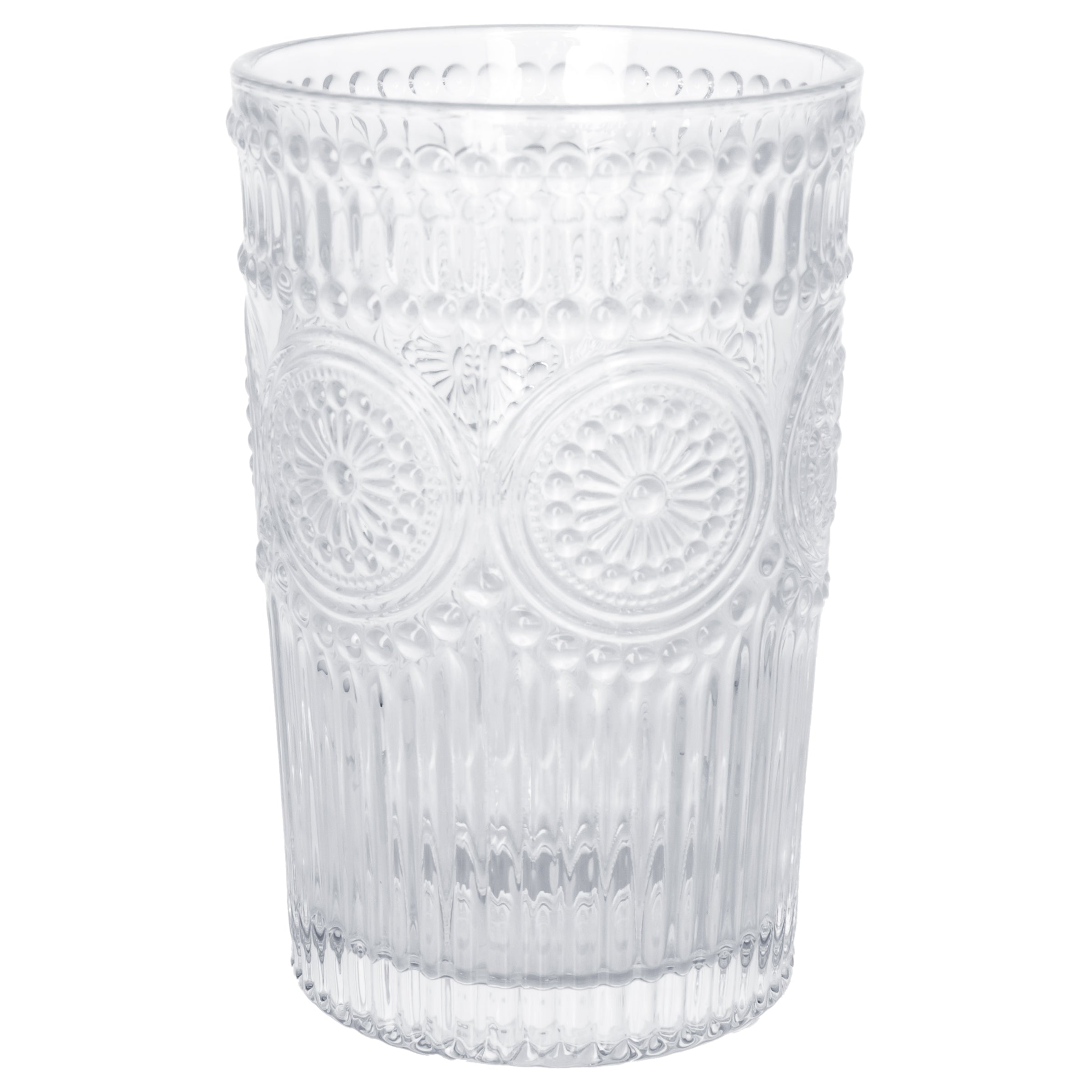 The Clear Codi Drinking Glass pairs vintage-inspired patterning with modern ease, turning everyday sips into a moment of shine. Pressed glass with raised medallions and refined ribs offers a comfortable hold while catching and scattering the light beautifully across the table. Approximate dimensions are 3.25 x 3.25 x 5 inches.