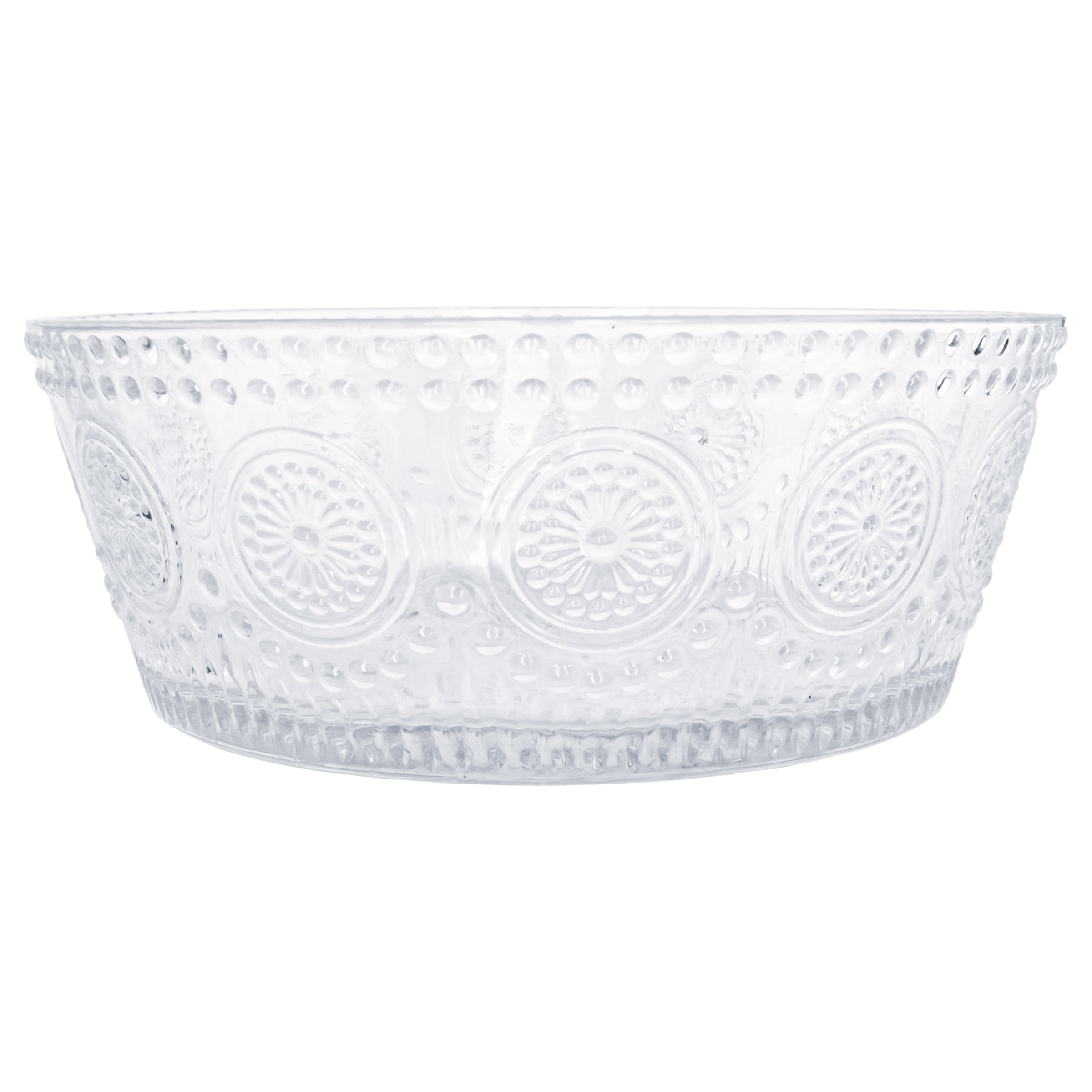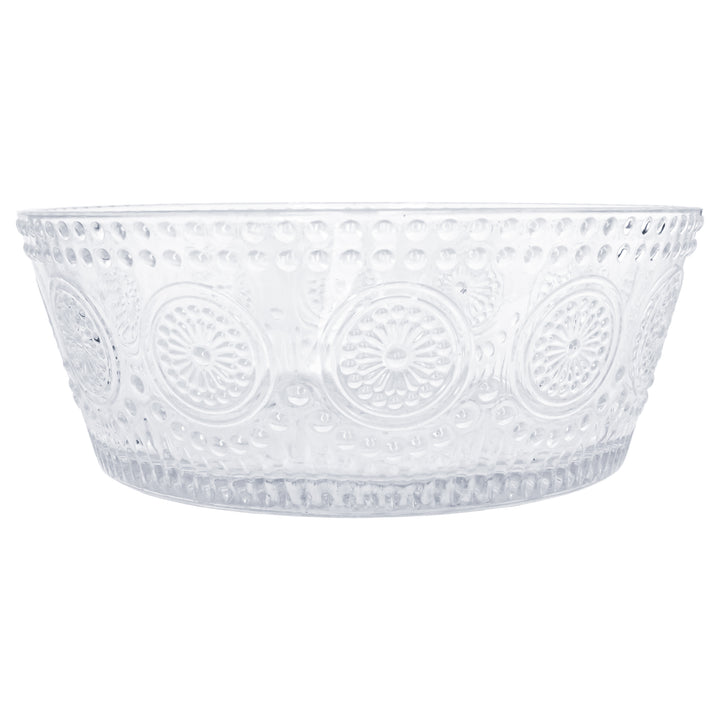 Etched with sunburst medallions and dotted texture, the Clear Codi Glass Bowl Small brings vintage-inspired pattern that catches the light beautifully. Perfectly sized for dips, nuts, or individual sides, this versatile glass serveware adds refined detail to everyday meals and elevated spreads alike. Approximate dimensions are 4.75 x 4.75 x 2.25 inches.
