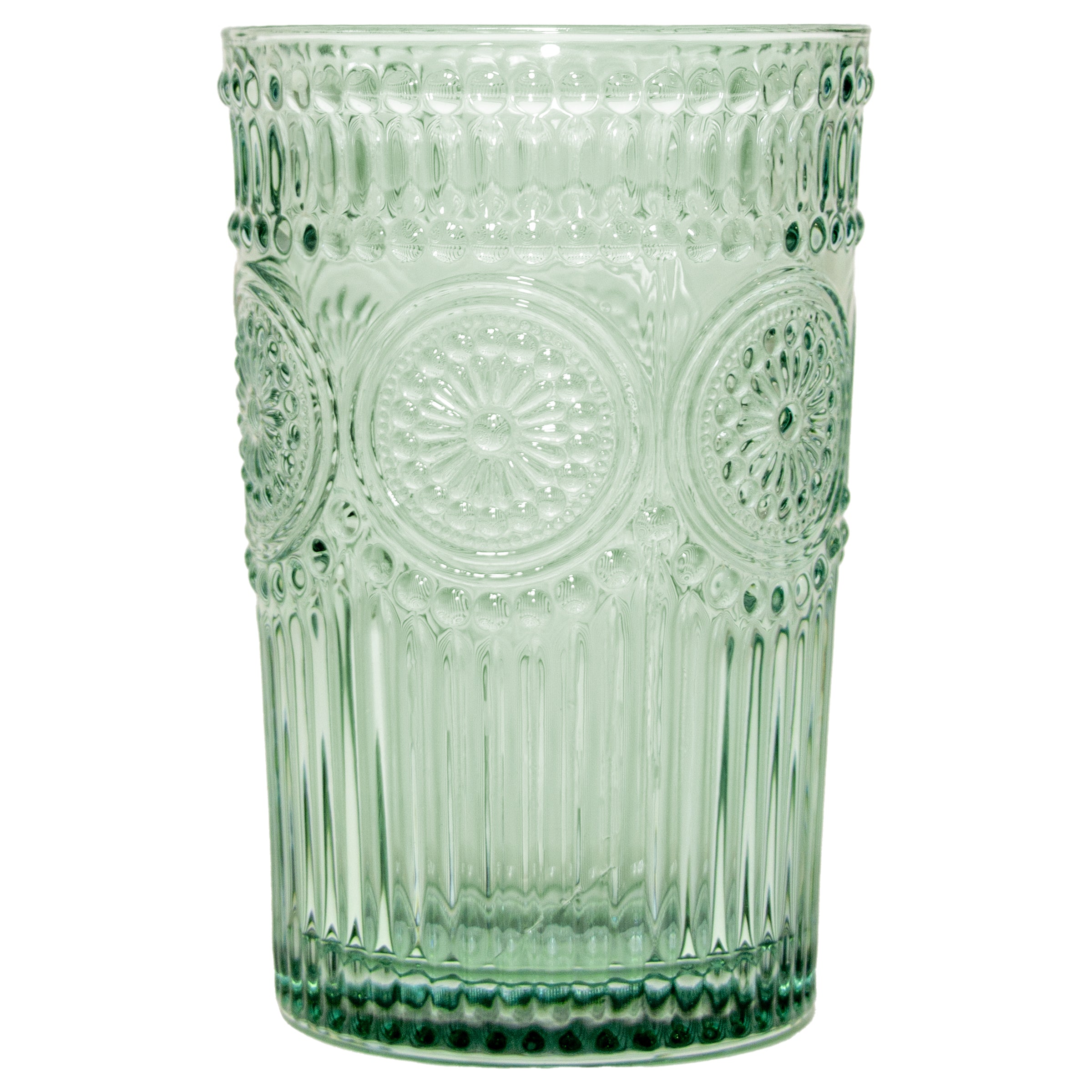 The Green Codi Drinking Glass pairs a refreshing tint with pressed-glass patterning—sunburst medallions and vertical ribs that catch the light and feel satisfyingly tactile in hand. Sturdy and versatile, this tall tumbler brings vintage character to everyday pours from breakfast juice to evening spritzes. Approximate dimensions are 3.25 x 3.25 x 5 inches.