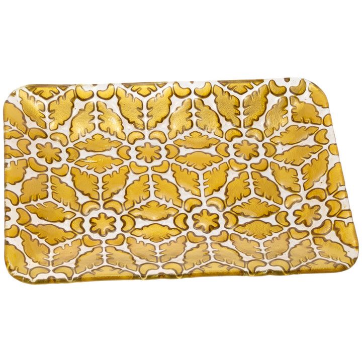 Intricate gold filigree patterns shimmer across this rectangular plate, creating a luminous focal point for the table. A radiant metallic finish elevates canapés, cheeses, and sweets, bringing artful polish to everyday serving. Approximate dimensions are 12 x 9 x 1 inches.
