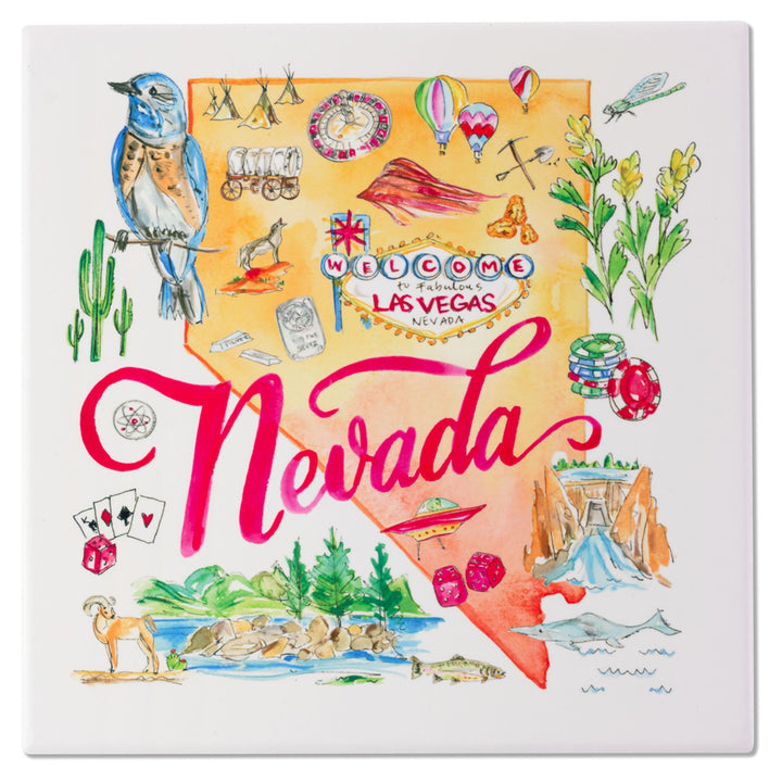 Celebrate Nevada at every meal with a colorful ceramic trivet featuring illustrated landmarks, wildlife, and playful nods to Las Vegas. A heat-resistant ceramic surface paired with a non-slip cork backing protects your tabletop from hot dishes, making this state-pride accent as functional as it is display-worthy. Approximate dimensions are 8 x 8 x .25 inches.