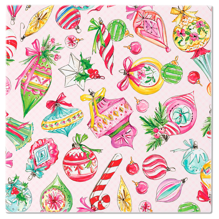 Bring nostalgic sparkle to the table with this ceramic trivet, illustrated with a lively collage of vintage ornaments in painterly, jewel-bright hues. Durable and heat-ready, it protects countertops and tabletops from hot pans and teapots while adding a cheerful focal point to every serving moment. Approximate dimensions are 8 x 8 x .25 inches.