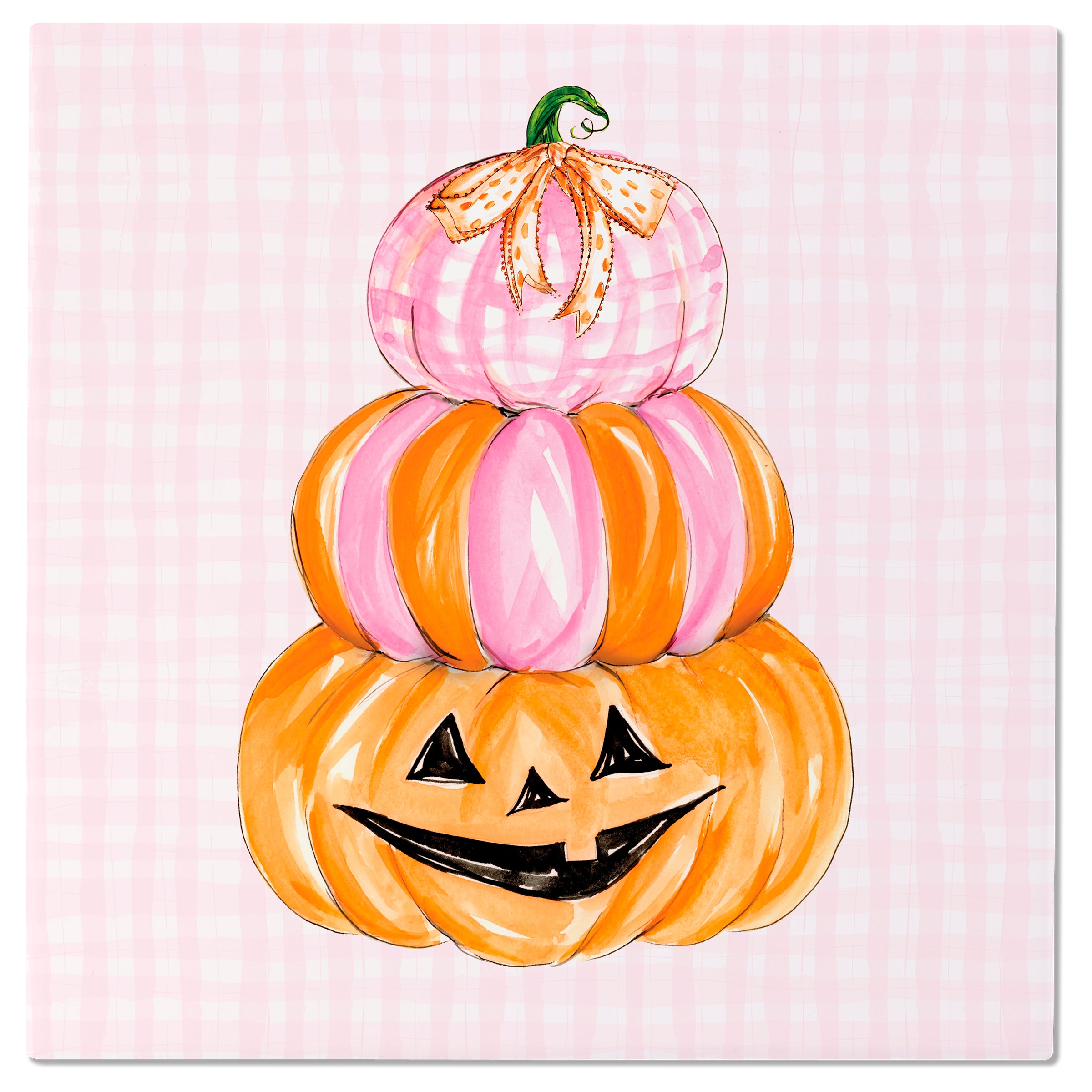 Bring playful charm to the table with this glossy ceramic trivet, where a stacked pumpkin trio in bubblegum and candy-corn stripes flashes a cheeky jack-o’-lantern grin. Crafted to shield countertops and serve hot dishes in style, the Pink Candy Corn Trivet delivers durable heat protection and easy wipe-clean care. Approximate dimensions are 8 x 8 x .25 inches.
