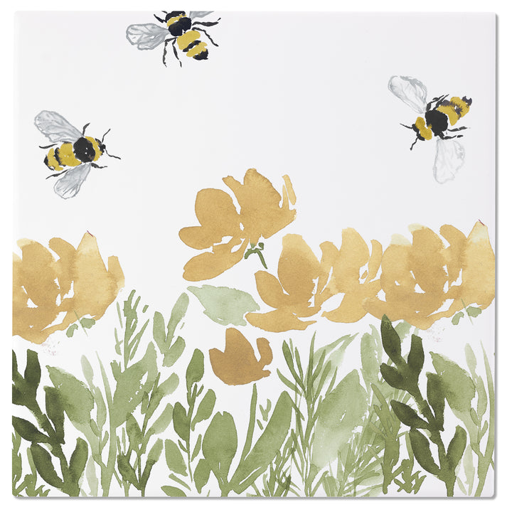 The Bee Field Trivet brings garden-chic charm to your spread, with painterly bees and golden blossoms dancing across smooth ceramic. Durable ceramic protects surfaces from hot dishes and wipes clean with ease, making this floral accent as practical as it is pretty. Approximate dimensions are 8 x 8 x .25 inches.