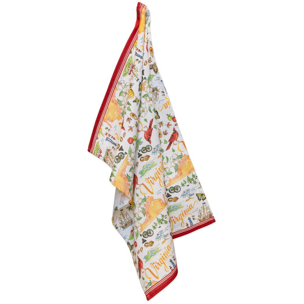 Bring hometown pride to the sink with this set of two cotton tea towels, featuring artful Virginia-inspired illustrations and finished with classic red stripe borders. Soft, durable, and absorbent, the coordinating pair—one boldly patterned and one lighter for a crisp look—makes drying, gifting, and everyday display a joy.
