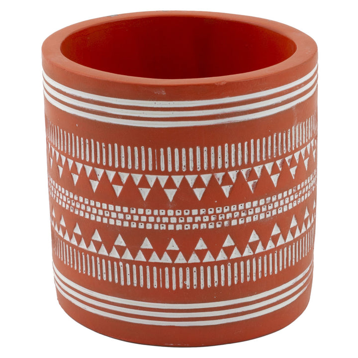 A terracotta-toned cement pot patterned with crisp geometric motifs brings warm, modern texture to your greenery. Small in scale yet satisfyingly sturdy, it neatly anchors succulents, herbs, or starter plants on shelves and windowsills. Approximate dimensions are 4.25 x 4.25 x 4.25 inches.