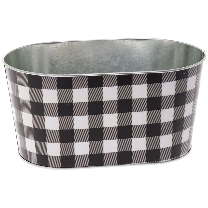 Graphic black-and-white checks wrap this oval metal tin, bringing a clean, modern accent to shelves, countertops, or tables. Sturdy and lightweight, it’s a versatile catchall—perfect for corralling utensils and remotes or showcasing a drop-in plant as an easy centerpiece. Approximate dimensions are 9 x 5.25 x 4.25 inches.