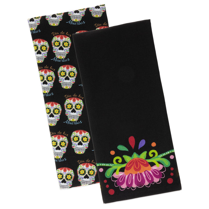 Bring cantina energy to your kitchen with this duo, pairing a lively sugar-skull print with a deep black towel finished with vibrant folkloric florals. Crafted from soft, absorbent cotton, these tea towels handle daily drying and spills while adding an artful, Latino-inspired pop of color. Approximate dimensions are 28 x 18 x inches.