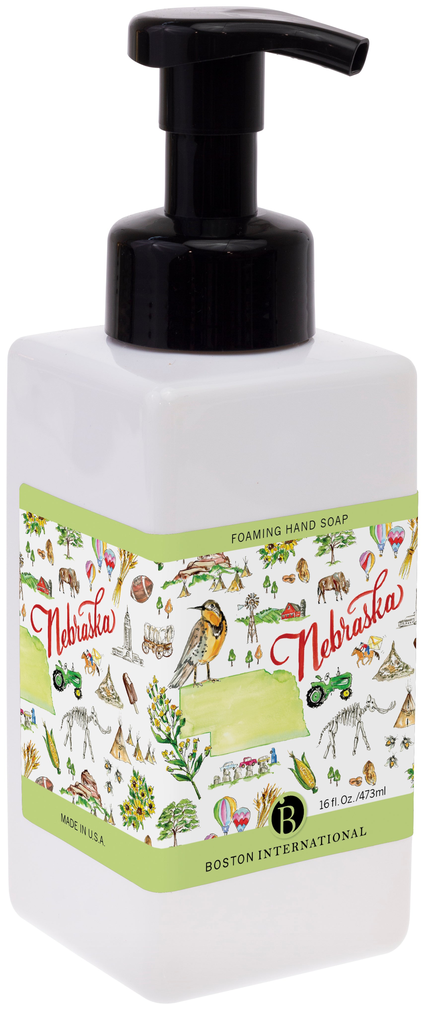 Bring a touch of prairie charm to the sink with Nebraska State Foaming Hand Soap, wrapped in lively state-themed illustrations that brighten bath or kitchen. A gentle glycerin-and-distilled-water formula delivers rich, airy lather from the sturdy pump bottle, cleansing hands comfortably for everyday use. Approximate dimensions are 2.5 x 2.5 x 8 inches.