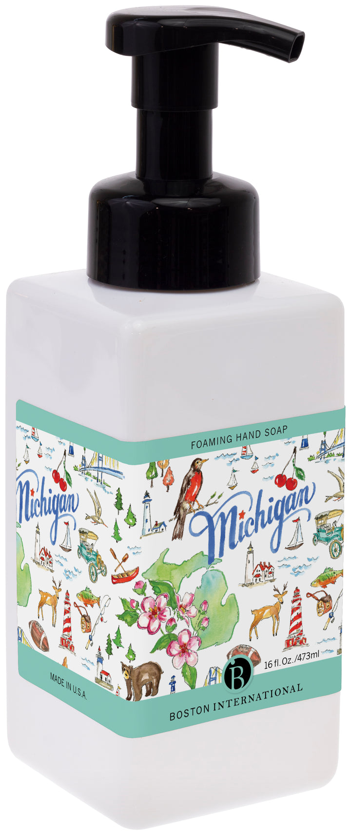 Bring a touch of Michigan pride to your sink with this foaming hand soap, wrapped in charming state illustrations and topped with a smooth-action pump. A gentle blend of glycerin and distilled water whips into a lush, airy lather that cleanses and leaves hands comfortable, all in a durable plastic bottle for effortless everyday use. Approximate dimensions are 2.5 x 2.5 x 8 inches.