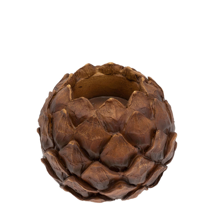 Cast in durable resin to capture the layered scales of a natural pinecone, this short tealight holder brings organic texture to any tabletop. Light it to let a soft, flickering glow play across the sculpted form, adding warm woodland charm to everyday settings. Approximate dimensions are 3.75 x 3.75 x 3.25 inches.