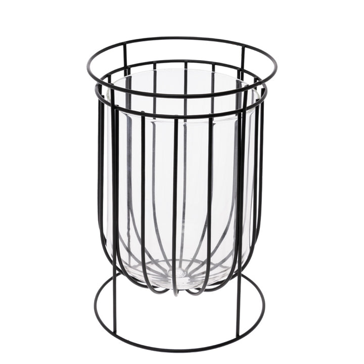 Sculptural and airy, the Small Black Wire Urn Vase pairs a slender black metal silhouette with a clear glass insert to showcase stems with modern poise. Its open framework lightens shelves and tables while the glass vessel keeps blooms, greenery, or branches neatly contained. Approximate dimensions are 5.75 x 5.75 x 8.5 inches.