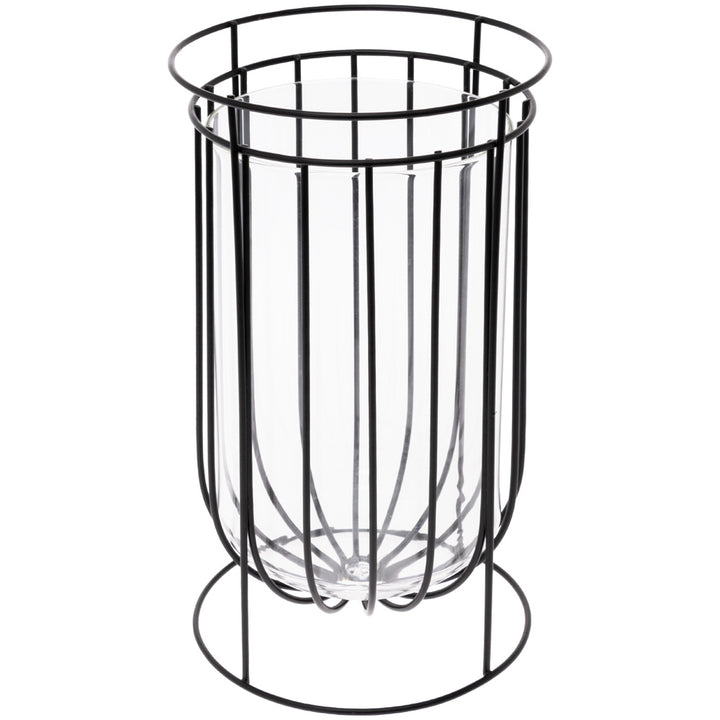 A sculptural black wire frame cradles a clear glass insert, creating an airy urn silhouette that spotlights blooms, greenery, or dried branches with effortless style. Striking enough to stand alone yet endlessly versatile, it adds modern character to consoles, dining tables, and entryways. Approximate dimensions are 5.75 x 5.75 x 10 inches.