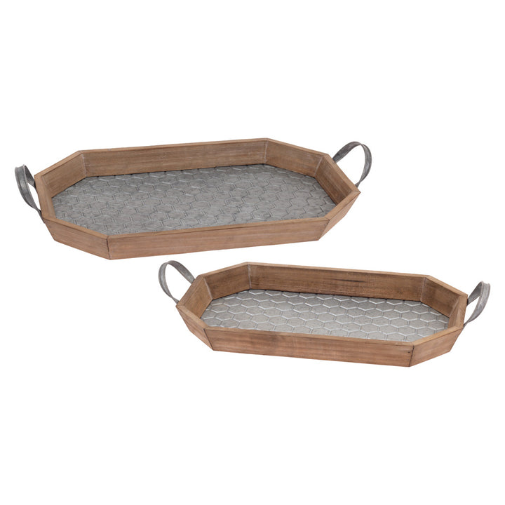 Crafted from firwood and metal, these elongated octagonal trays showcase a textured honeycomb base and easy-grip metal handles for a warm-meets-industrial look. The set of two serves beautifully and styles effortlessly, from carrying drinks to corralling décor on a coffee table, kitchen island, or entry console. Approximate dimensions are 19.5 x 12 x 1.75 inches.