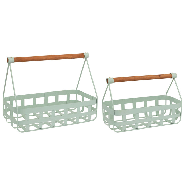 Finished in a soft sage, these open-grid metal baskets are topped with smooth firwood handles for an easy, hand-hewn touch. Offered as a set of two sizes, they stylishly corral produce, towels, or mail while moving effortlessly from pantry to tabletop. Approximate dimensions are 14 x 7.5 x 10.5 inches.