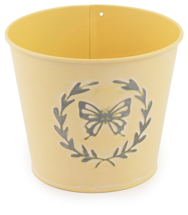 Bring a cheerful flutter to shelves and tabletops with this metal Yellow Butterfly Bucket, finished in a soft buttery hue and detailed with a laurel-crowned butterfly motif. Perfect for herbs, succulents, or small tools, its sturdy design works as a charming planter or catchall that brightens everyday spaces. Approximate dimensions are 5 x 5 x 4.5 inches.