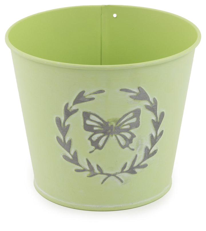 Invite a whisper of whimsy to shelves and windowsills with the Green Butterfly Bucket, a durable metal planter in fresh green with a softly weathered butterfly-and-laurel motif. Ideal for herbs, succulents, or small blooms, this versatile accent adds easy, nature-inspired charm to any room. Approximate dimensions are 5 x 5 x 4.5 inches.