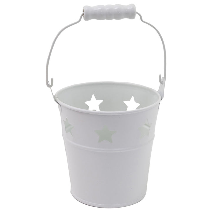 A crisp white metal pail punched with star cutouts, the White Star Bucket brings playful, minimalist charm to shelves and countertops. Its sturdy carry handle and compact profile make it ideal for corralling craft tools, desk supplies, or other small essentials while doubling as an easygoing decor accent. Approximate dimensions are 4 x 4 x 4 inches.