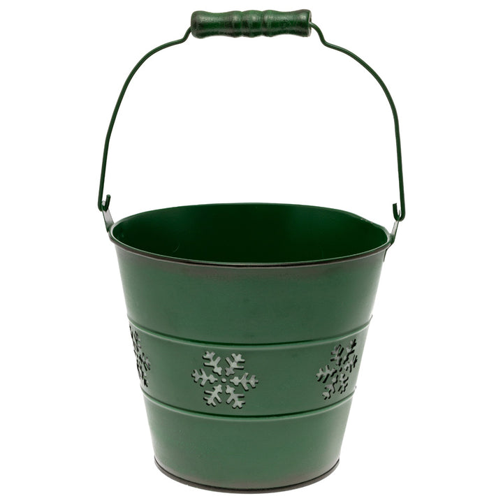 Saturated in forest green, this pail features crisp snowflake cutouts that bring airy pattern and dimension to any vignette. Style it as a planter sleeve or catchall, or drop in an LED candle to let the cutouts glow, all carried with ease by the smooth, pivoting handle. Approximate dimensions are 6.5 x 6.5 x 6 inches.
