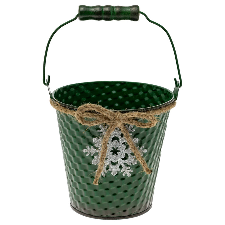 Textured in deep green and adorned with a shimmery silver snowflake and a twine bow, this pail brings crisp, wintry charm to shelves, tables, and entryways. An easy-carry handle makes it perfect for corralling greenery, utensils, treats, or small essentials while tucking neatly into any vignette. Approximate dimensions are 4.5 x 4.5 x 4.5 inches.